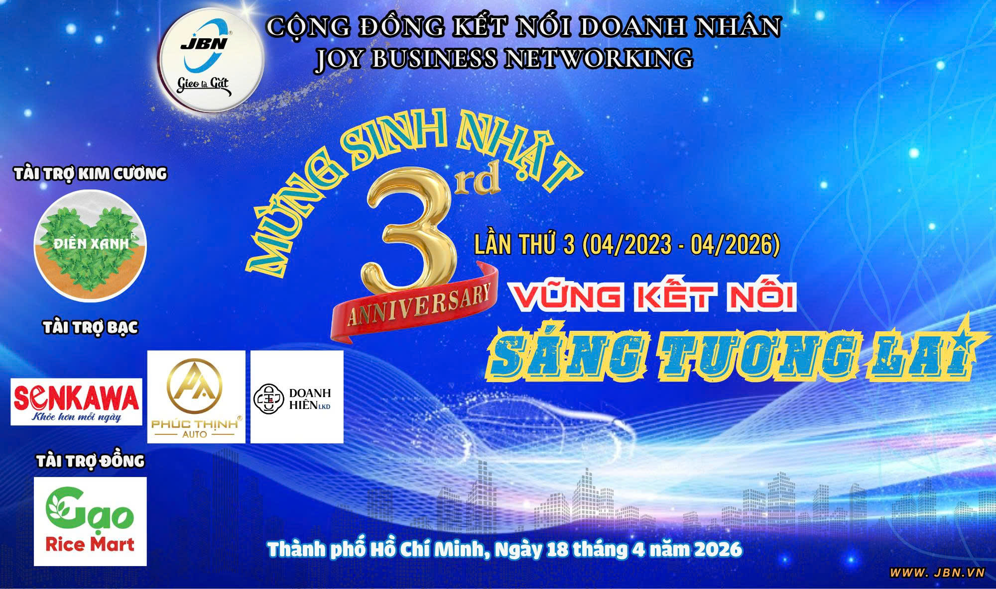 Chỉ còn 4 ngày nữa, sự kiện kỷ niệm 3 năm hình thành và phát triển của cộng đồng sẽ chính thức diễn ra tại TP. Hồ Chí Minh. Đây là cột mốc quan trọng, đánh dấu hành trình không ngừng nỗ lực xây dựng, mở rộng mạng lưới kết nối và gia tăng giá trị cho cộng đồng doanh nhân trong suốt thời gian qua.